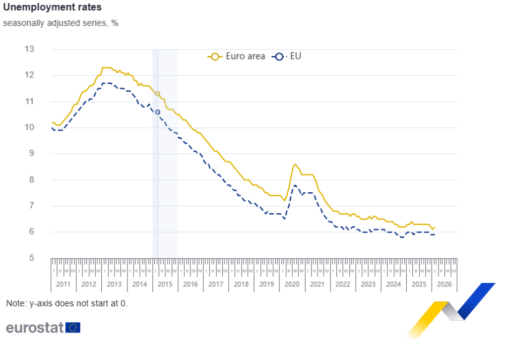 Sezonski prilagođena stopa nezaposlenosti u eurozoni u februaru 2026. iznosila je 6,2 posto, što je porast u odnosu na 6,1 posto u januaru 2026., ali i pad u odnosu na 6,3 posto u februaru 2025.
